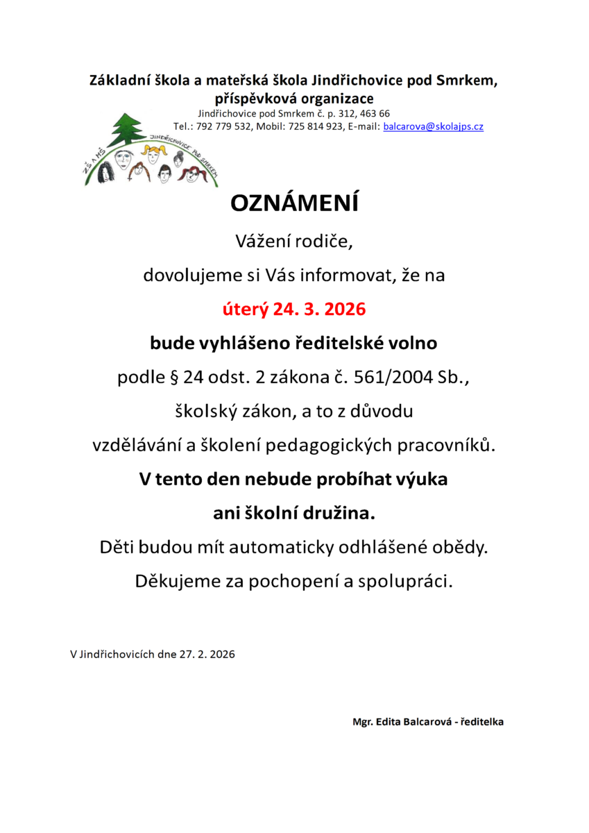 Na úterý 24. 3. je vyhlášeno ředitelské volno a v tento den nebude probíhat výuka ani školní družina, z důvodu vzdělávání a školení pedagogických pracovníků.